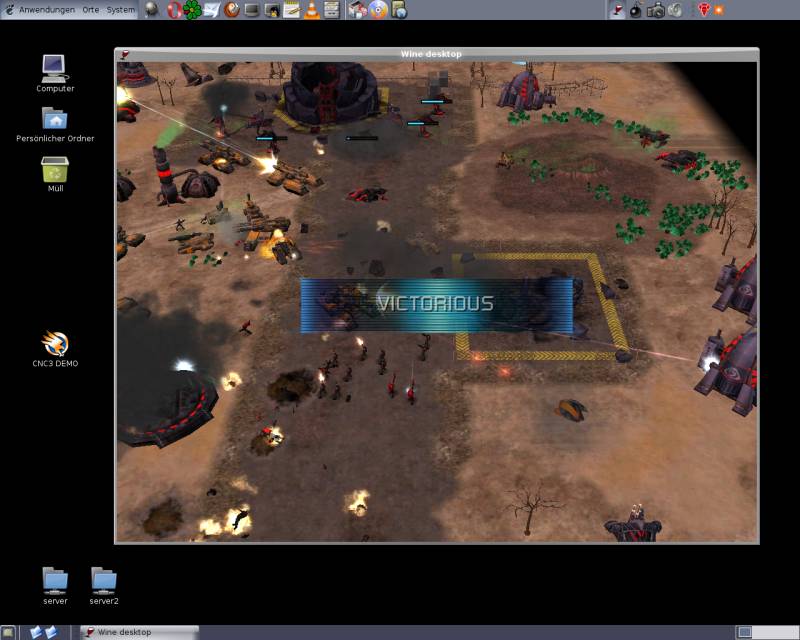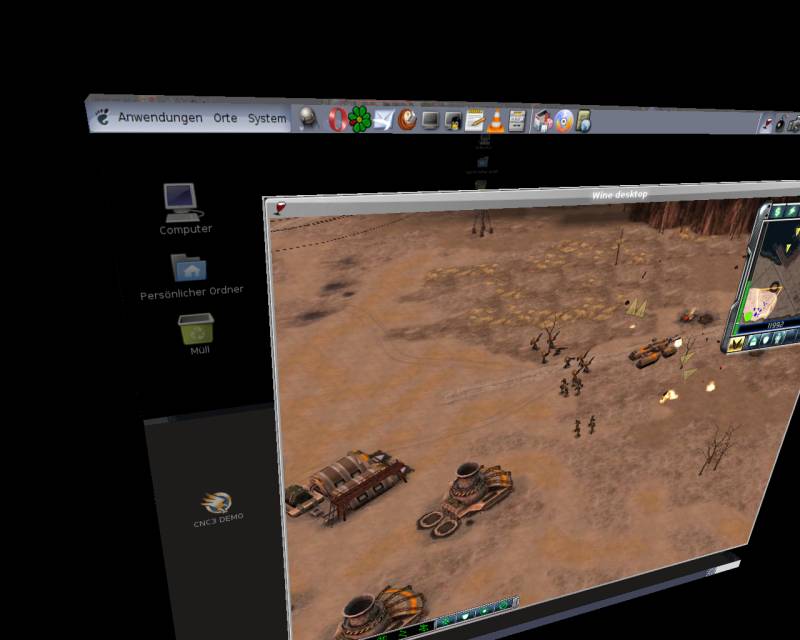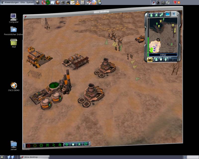 Von Command & Conquer mit Wine hab ich schon vorher gelesen, und jetzt auch mal selber zum laufen bekommen. Leider ist die Demo beim spielen im Skirmish Modus abgestürzt. Ich hatte kein Sound und musste Grafik signifikant runterstellen.